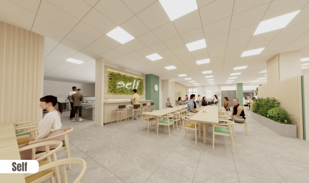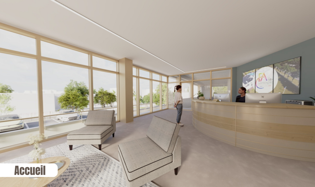 Avec un hall lumineux, le CFAie donne le ton des espaces d’accueil de ses futurs bâtiments. Le self, le foyer et l’espace détente suivent la même ambiance chaleureuse.