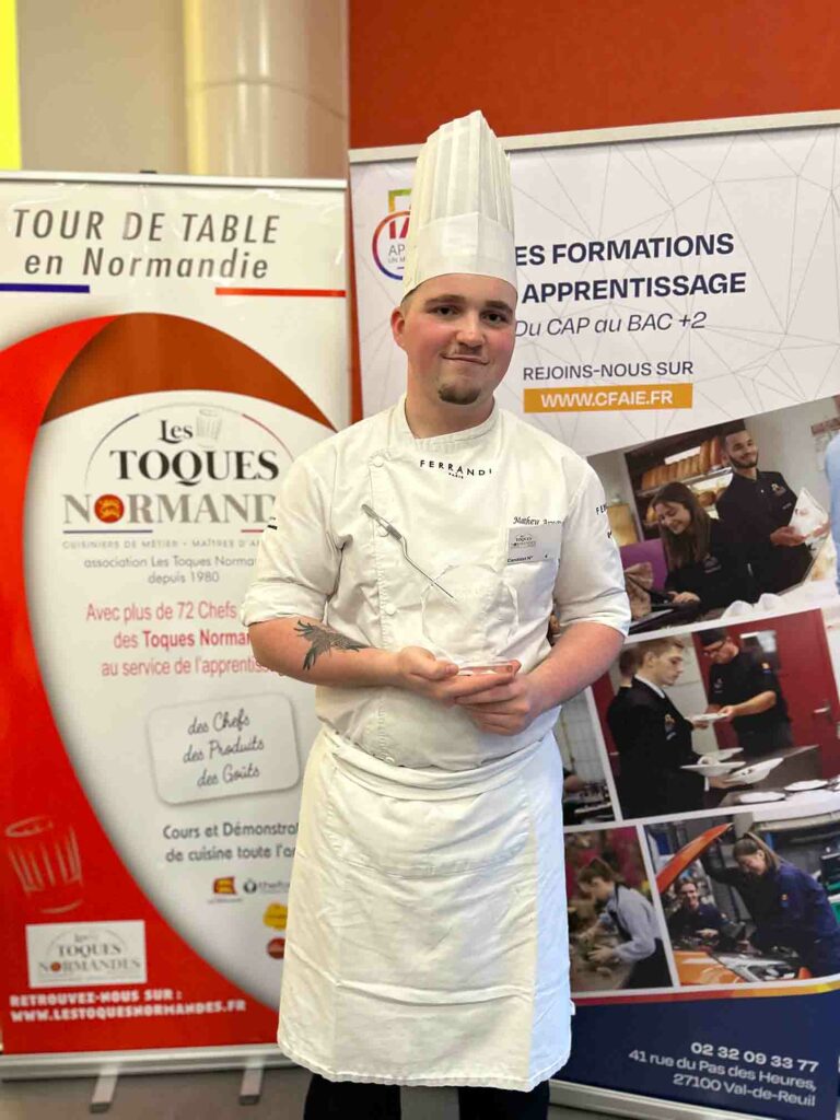 Pas moins de onze apprentis issus de huit établissements normands ont participé avec enthousiasme à cette compétition (CFAie – Val-de-Reuil ; Lycée Jean-Baptiste Décretot – Louviers ; Lycée Hôtelier Georges Baptiste – Canteleu ; IFA Marcel Sauvage – Mont-Saint-Aignan ; ICEP – Caen ; 3IFA – Alençon ; FIM CCI Formation – Saint Lô ; CMA Formation Eugénie Brazier – Dieppe). Cette diversité a reflété toute la richesse des formations culinaires normandes, soit par l’apprentissage ou en formation scolaire.